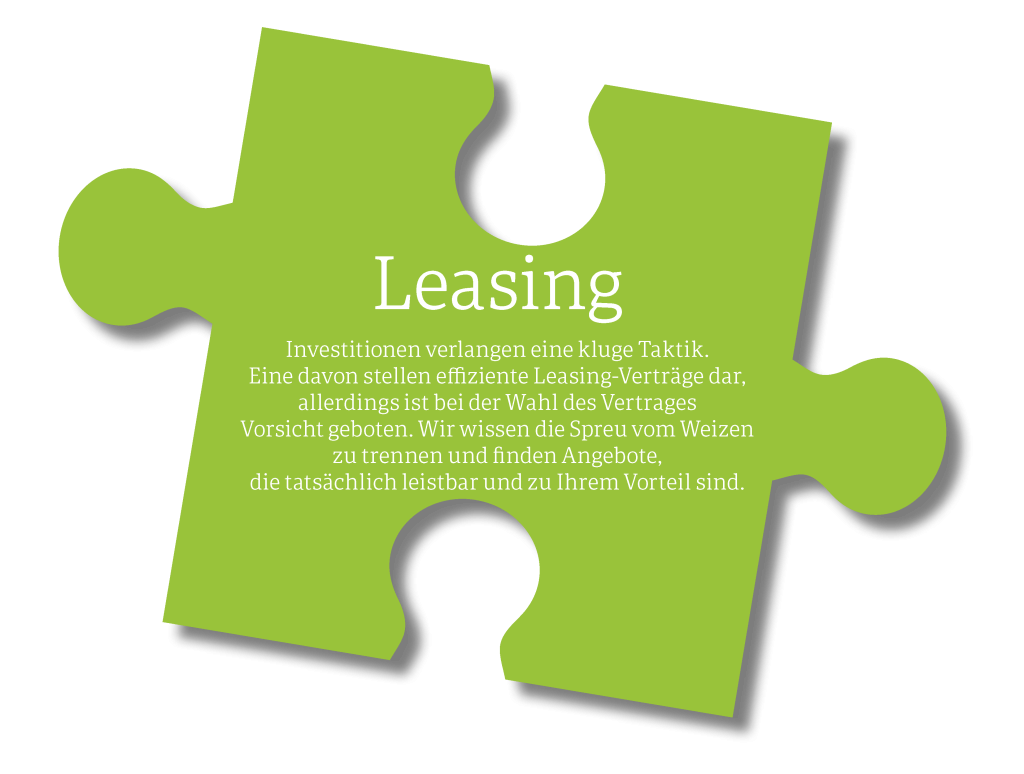 Mit unserem Leasing-Service finden wir maßgeschneiderte Lösungen für jeden Finanzierungswunsch. Bei unserer umfassenden und unverbindlichen Beratung erfahren Sie beispielsweise auch, dass es selbst für nicht mehr leasingfähige Gebrauchtwagen noch Finanzierungsmöglichkeiten gibt. Wir teilen unser Wissen gerne mit unseren Kunden und schaffen auf diese Weise effiziente Leasing-Verträge, die auch inklusive Kleingedrucktem zu Ihrem Vorteil sind!